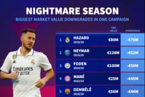 1、阿扎尔:2019/20赛季跌至8000万,下跌7000万